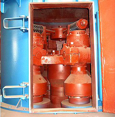 工作時,將需要粉碎的物料從機罩殼側(cè)面的進料斗加入機內(nèi),依靠懸掛在主機梅花架上的磨輥裝置,繞著垂直軸線公轉(zhuǎn),同時本身自轉(zhuǎn),由于旋轉(zhuǎn)時離心力的作用,磨輥向外擺動,緊壓于磨環(huán),使鏟刀鏟起物料送到磨輥與磨環(huán)之間,因磨輥的滾動碾壓而達到粉碎物料的目的。